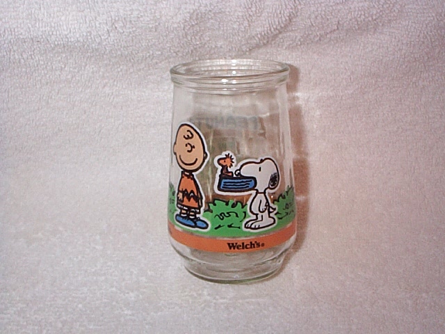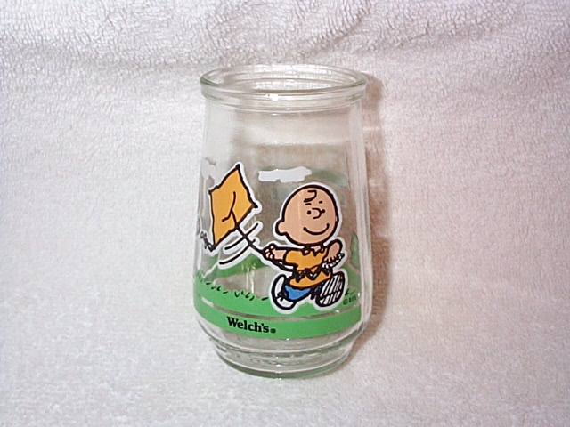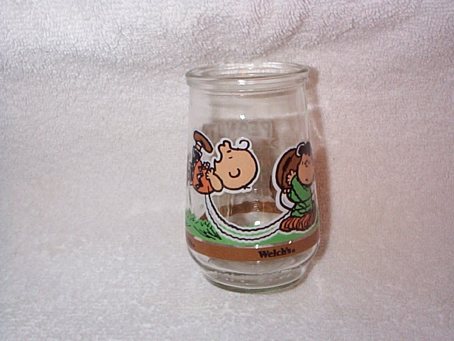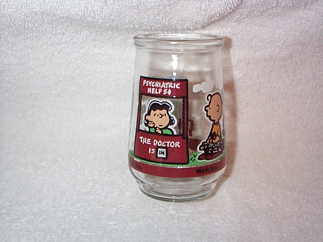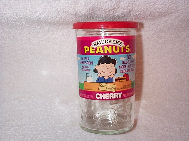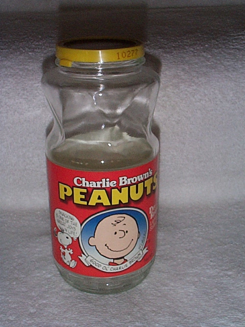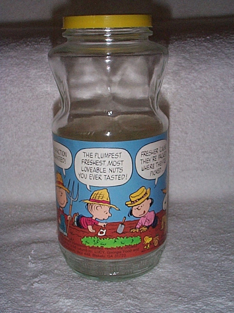 empty 16 ounce jar with label of Charlie Brown, Linus, Lucy,