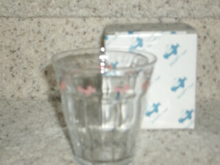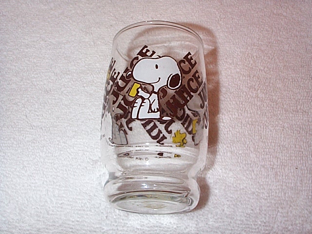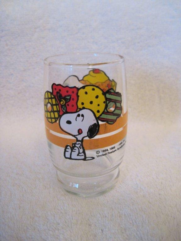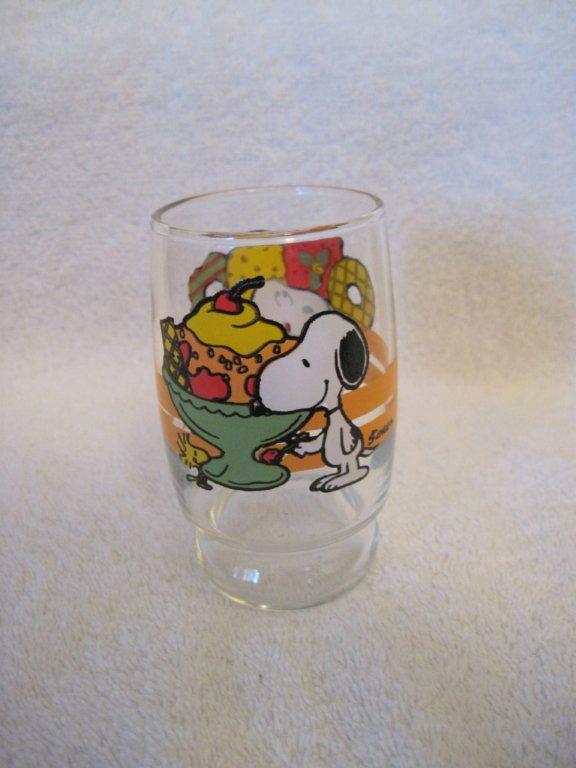 Juice glass - Snoopy thinking of pastries on one side; Snoopy & Woodstock with sundae on the other side (6 available) | $7/each |