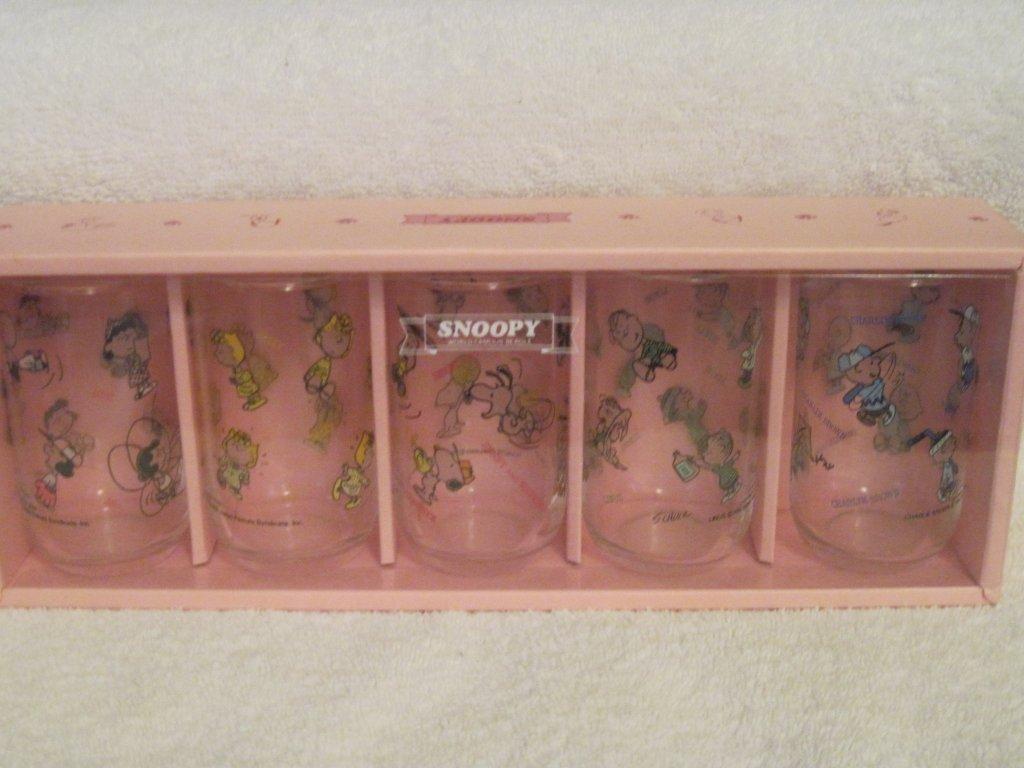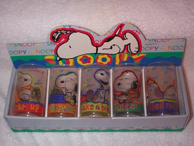 6" tall glass with Snoopy and 5 2.5" glasses with